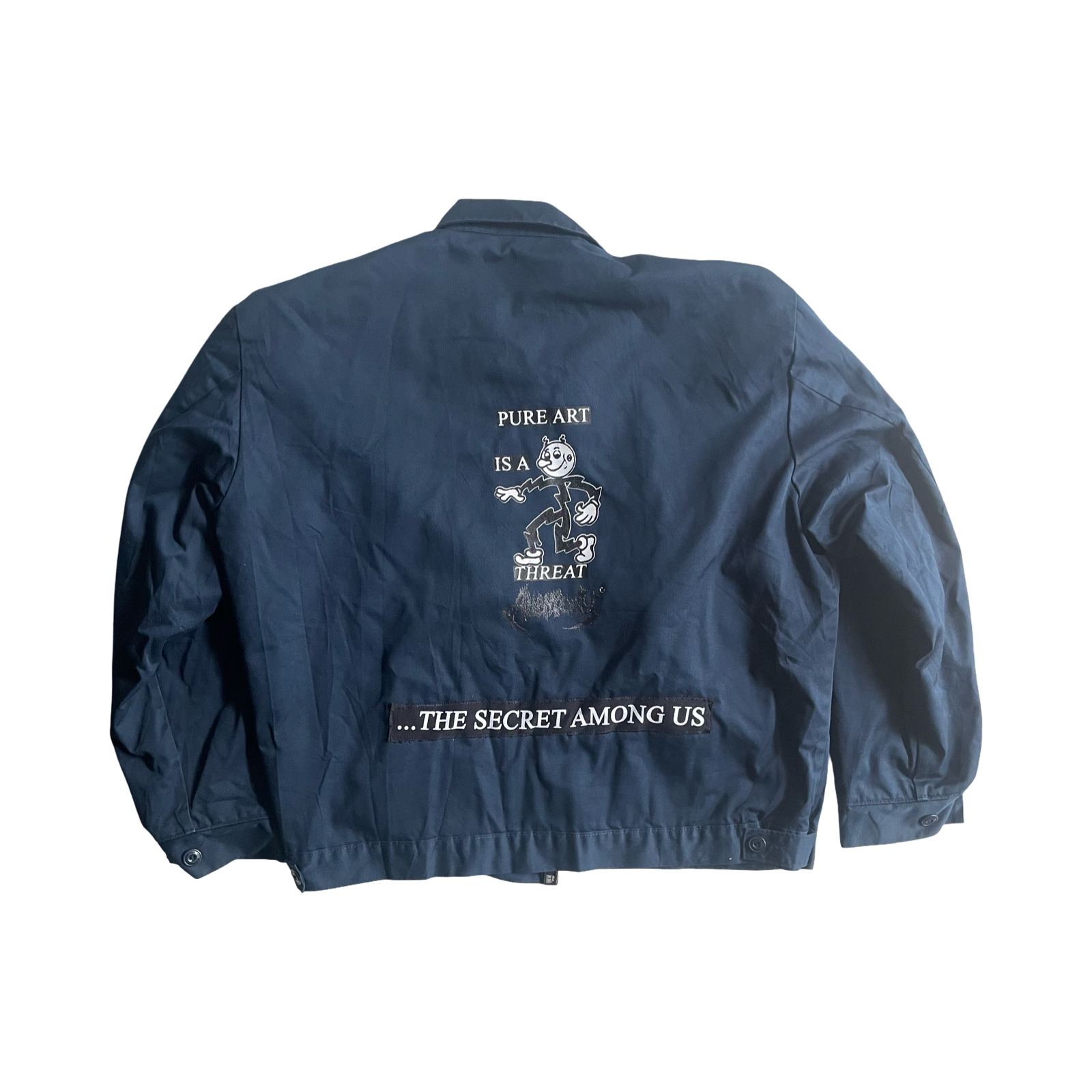 silk screened on vintage "Red Kap" navy blue industrial work jacket.